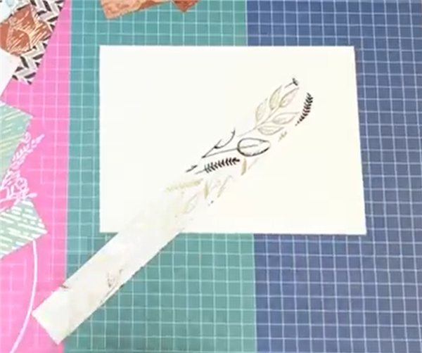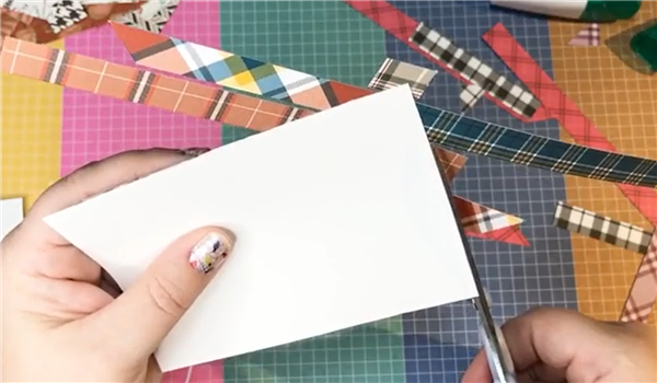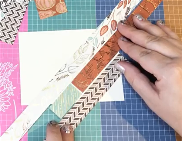 Begin adhering your strips down on the 3 3/4" x 5" cardstock you cut. Start by angling one of your longer strips in the center of the cardstock.